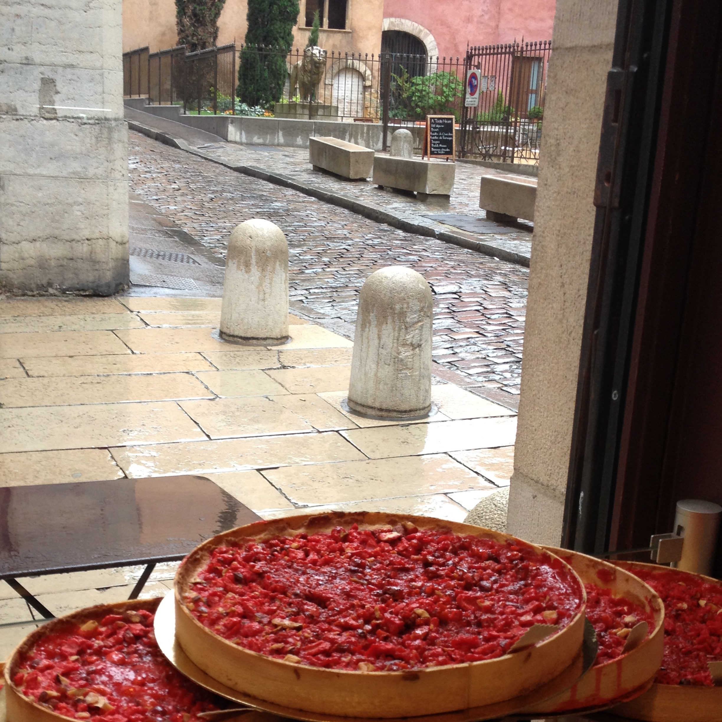 Les tartes aux pralines roses de chez » A la marquise » rue Saint Jean dans le vieux Lyon: J’adore les pralines roses et j’ai découvert la tarte aux pralines lorsque j’étais enfant avec celles de Jean Masson de la Minaudière qui était ami de mes parents. ♡