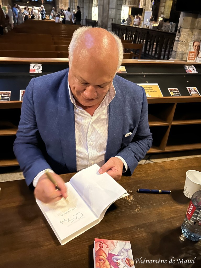 - Eric-Emmanuel Schmitt était venu à Lyon pour parler de son dernier livre le défi de Jérusalem, il y avait une séance de dédicace dans une librairie et après une conférence au sein d’une église où je suis allée l’écouter, c’était la seconde fois que je le voyais. je l’avais vu une première fois il y a plus de 10 ans. Bien évidemment je lui ai fait dédicacer le livre que je venais d’acheter.